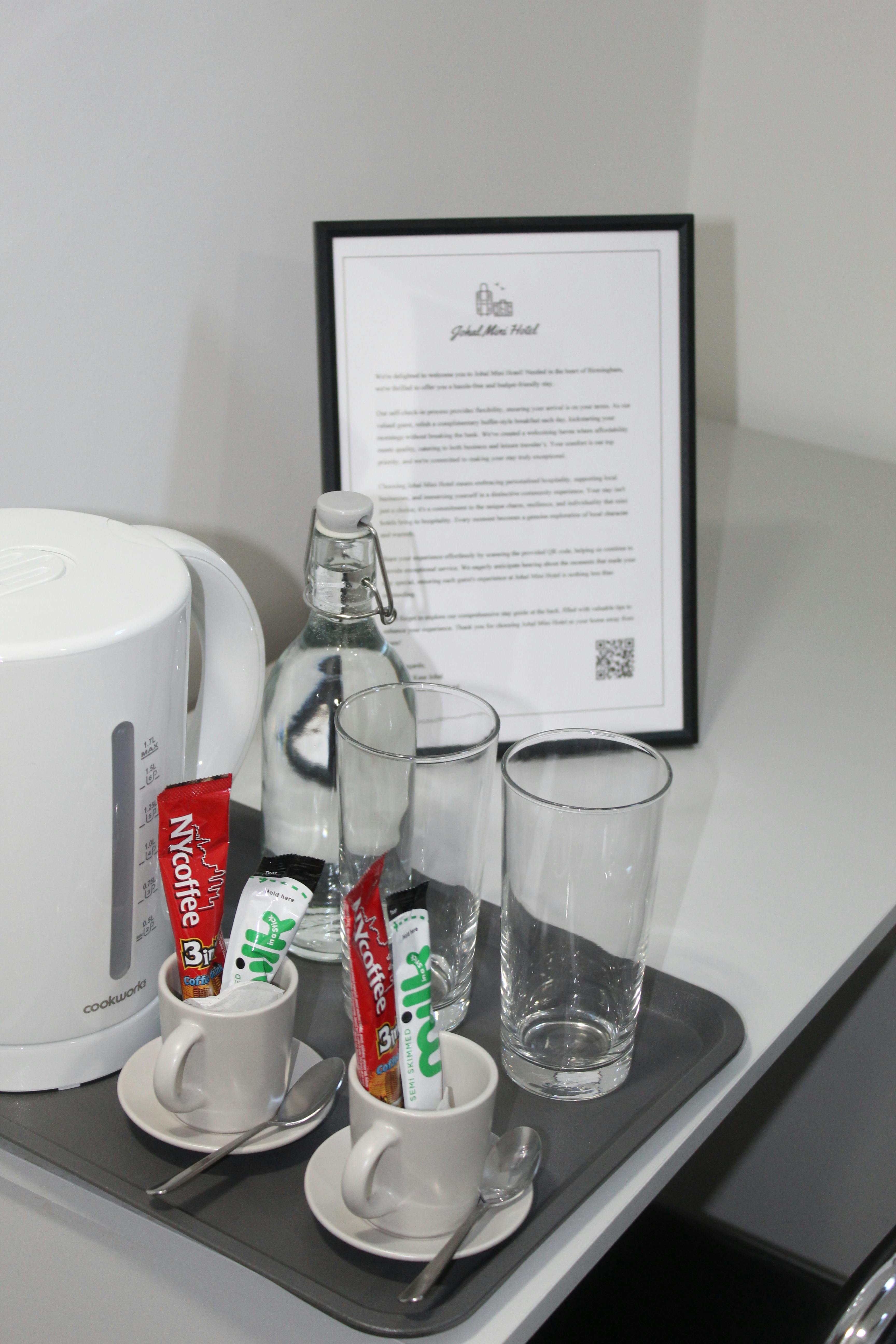 For your refreshment needs, a thoughtful setup includes a kettle along with a complimentary bottle of water, glasses, and a charming tea mug. Choose from a variety of teas and coffees provided, allowing you to savor a warm beverage at your leisure.